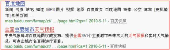 例子中的網(wǎng)頁(yè),提供全國(guó)主要城市的天氣預(yù)報(bào)服務(wù),第一個(gè)結(jié)果中,使用了百度地圖默認(rèn)的t i t l e ,用戶在搜索結(jié)果無法判斷這個(gè)網(wǎng)站提供的內(nèi)容是什么,也就不會(huì)點(diǎn)擊這個(gè)結(jié)果,第二個(gè)結(jié)果中,t i t l e 很明確的寫明了所提供的內(nèi)容,用戶判斷起來比較容易,選擇這個(gè)結(jié)果的可能性比較大。
