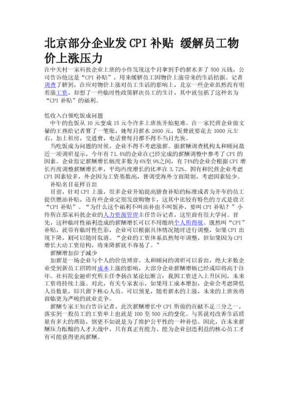 北京部分企業(yè)發(fā)CPI補(bǔ)貼 緩解員工物價上漲壓力